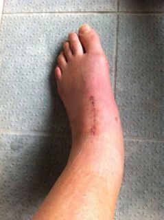 My surgeon Mr Pilau showed me the first scan I had taken and I couldn’t believe the size of the break (obviously scaled bigger on the scan) but it was still a lot bigger than I originally thought). He then went on to say in his own words that, he could imagine ‘this type of injury in a motorcycle accident’ rather than from running and that the ‘bone had splintered in several parts and some of the surrounding bone was like mush’. Due to this they inserted a metal plate around the bone to make it stronger, which I keep in my foot unless it disrupts my training. Yes, he honestly said ‘like mush’ and bone definitely should never be described as ‘mush’! But I have followed everything he has told me to do and thankfully it is on the way to recovery!The other day I had a little stumble coming out the car, attempting to carry a water bottle, strawberries, heat magazine and a bag. The next day my foot looked like this… <—
